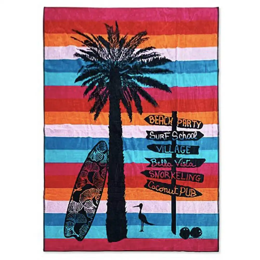 La serviette plage 140×200 composter un motif surfer qui apporte une touche de style. Un motif composé d’un majestueux palmier avec à son pied une planche de surf, des panneaux d’affichage et deux belles noix de coco, sur un fond de rayures aux nuances vives. un design qui apporte une touche de soleil et d’excursion à vos journées plage.