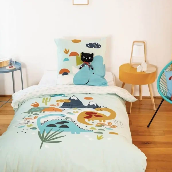 La housse de couette est imprimée de dinosaures aux formes rondes et stylisées dans des coloris bleu, vert.