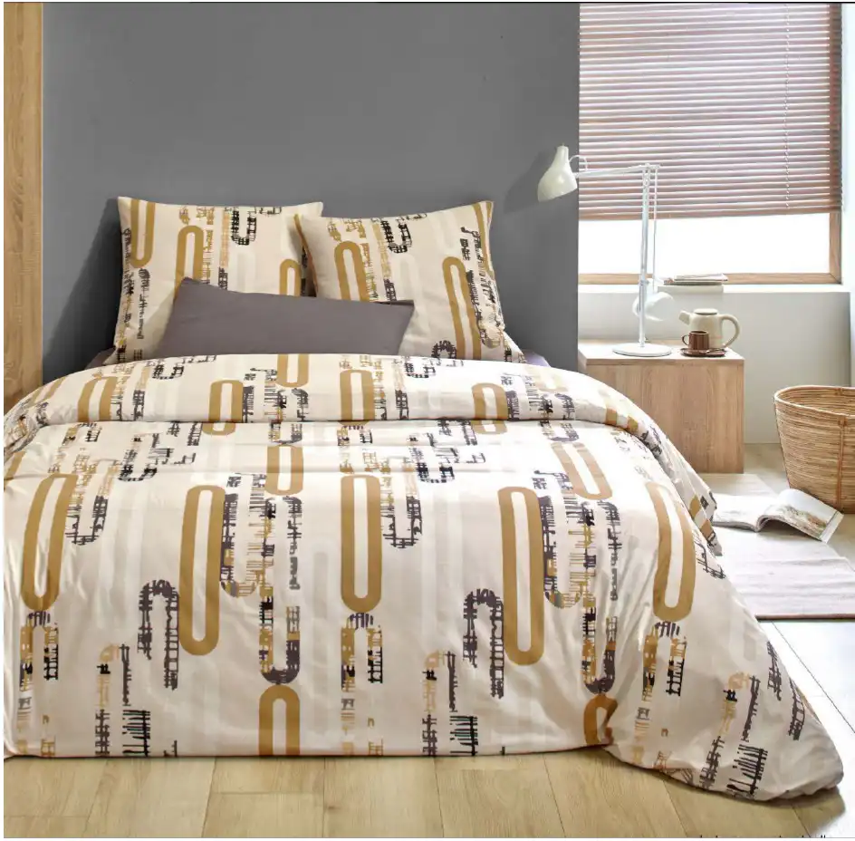 Cette housse de couette 240×220 et ses 2 taies oreiller 65×65 se distingue par ses motifs graphiques originaux aux couleurs tendance, mélangeant le jaune ocre, le gris et le beige.