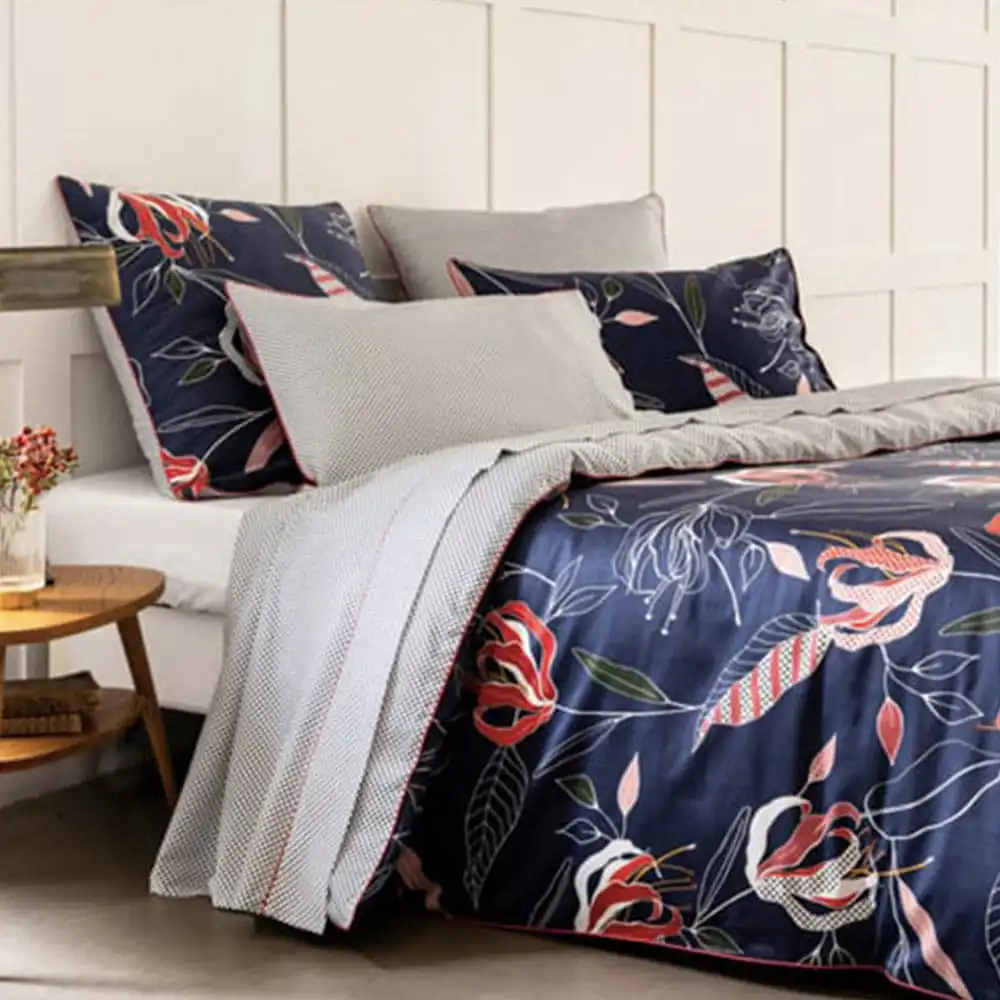 Son imprimé de ces grandes fleurs dans les tons rouge, saumon sur un fond bleu, rendra votre intérieur sophistiqué et dynamique.