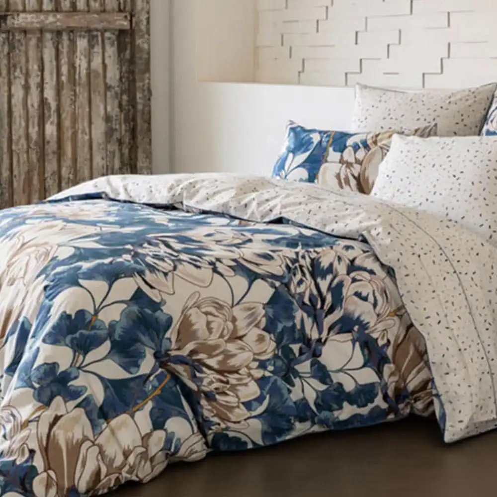 La taie percale oreiller est dotée d’un imprimé de grandes fleurs surplombant le fond blanc, dans les tons bleu ciel, bleu marine et beige.